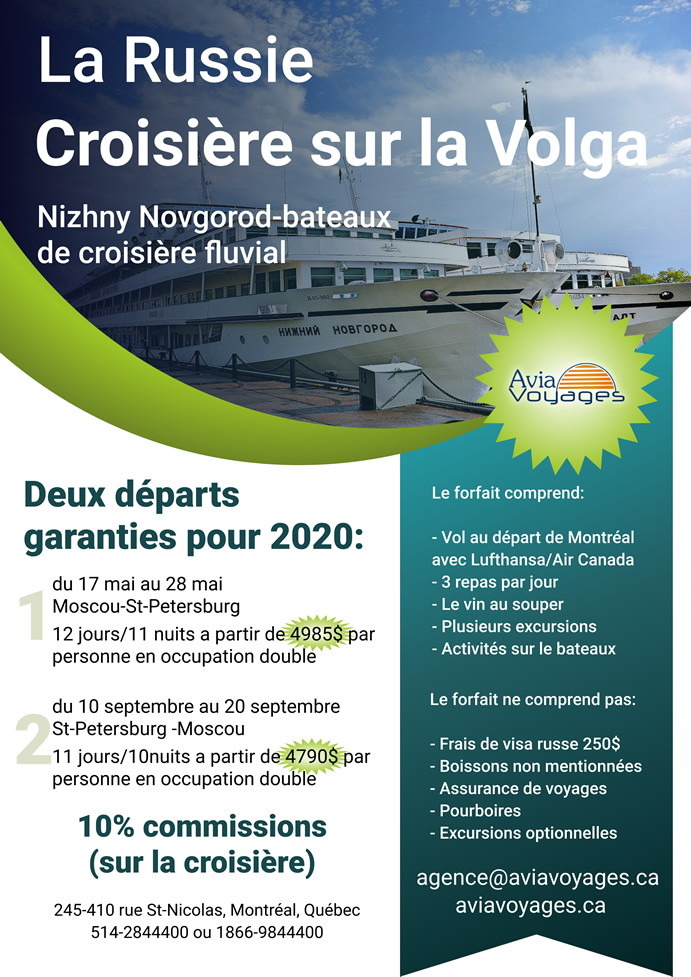 Avia Voyages invite les agents de voyages à découvrir la Russie et les croisières sur la Volga lors d'une soirée informative qui se tiendra le 14 août 2019 au consulat général de Russie à Montréal.