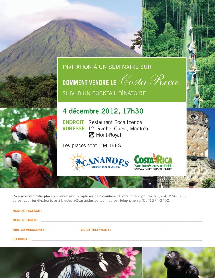 Le voyagiste Canandès convie les agents de voyages au séminaire '' Comment vendre le Costa Rica '' qui se tiendra le 4 décembre à 17h30 à Montréal au restaurant Boca Iberica, situé au 12 Rachel Ouest, Métro Mont-Royal.