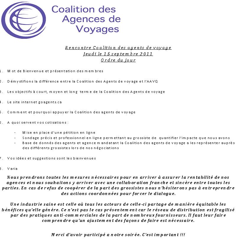La coalition des agents de voyages qui se réuni pour la première fois ce jeudi soir, fait circuler l'ordre du jour de la réunion. Pour le consulter, cliquer sur l'image ci-dessous.