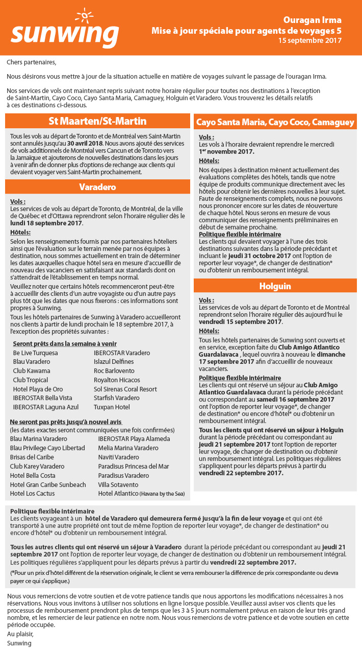Ouragan Irma : Mise à jour de Sunwing du 15 septembre