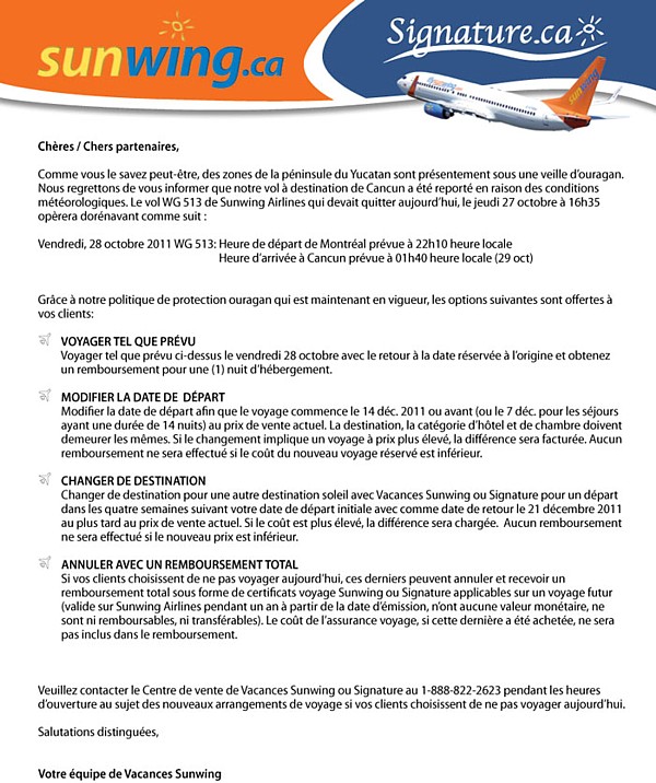 Sunwing annonce que son vol 513 pour Cancun de ce jeudi soir 27 octobre est reporté à demain.