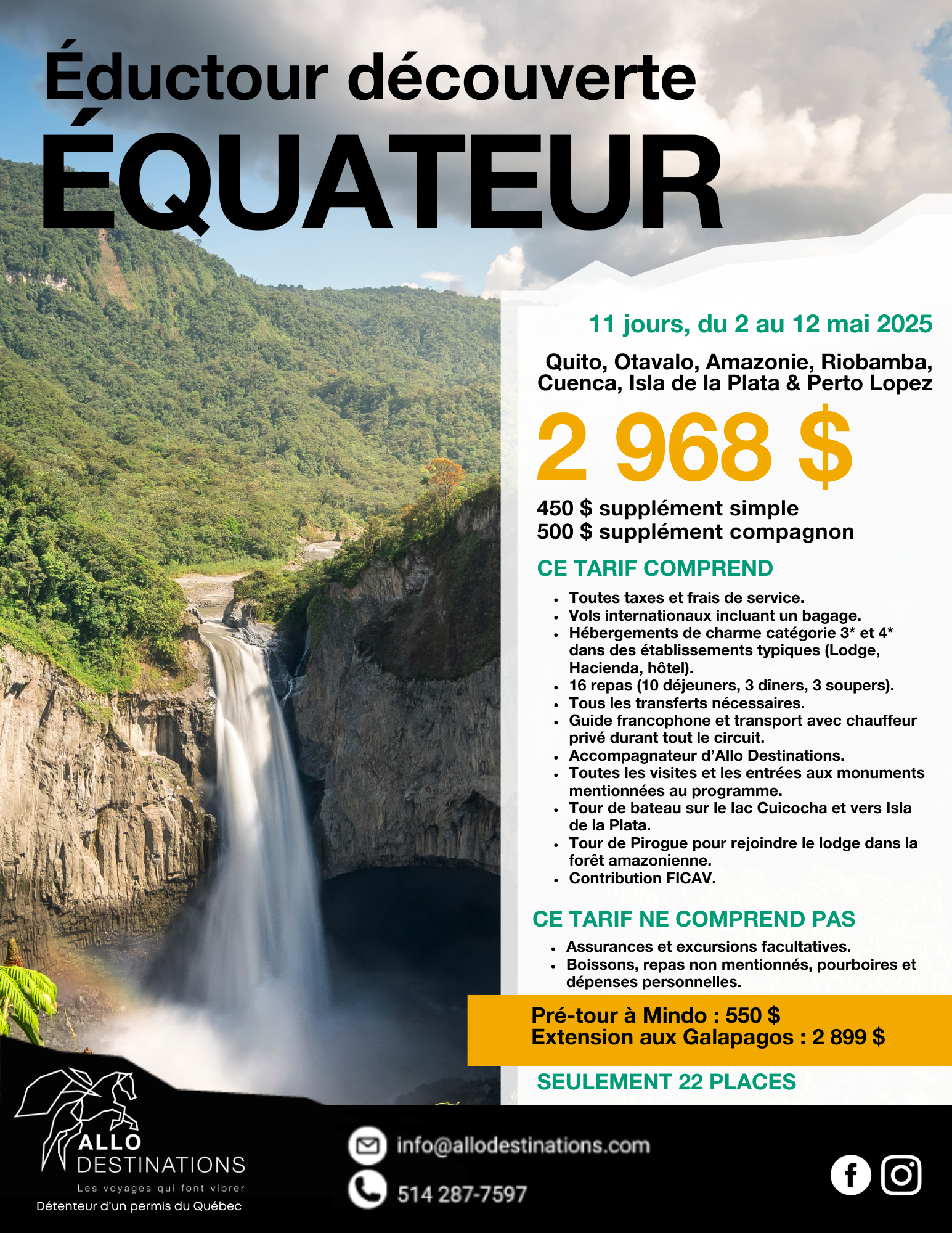 Pour la sixième année, Allo Destinations invite les conseillers en voyage du Québec et leurs compagnons à participer à son Éductour annuel en Équateur. Pendant 11 jours, du 2 au 12 mai 2025, les participants découvriront les trésors naturels et culturels de cette destination unique. Un prétour à la forêt des nuages de Mindo et une extension aux îles Galápagos sont également proposés aux agents de voyage, à des tarifs préférentiels.